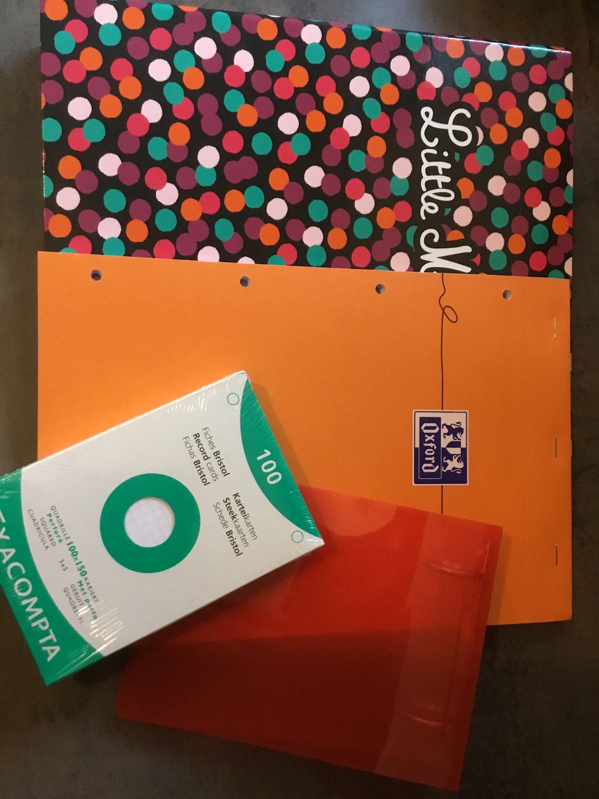Les feuilles bristols viennent de chez cultura ,le trieur (pas sur la photo),le classeur ,le bloc de feuille et le mini classeur viennent de chez Leclerc
